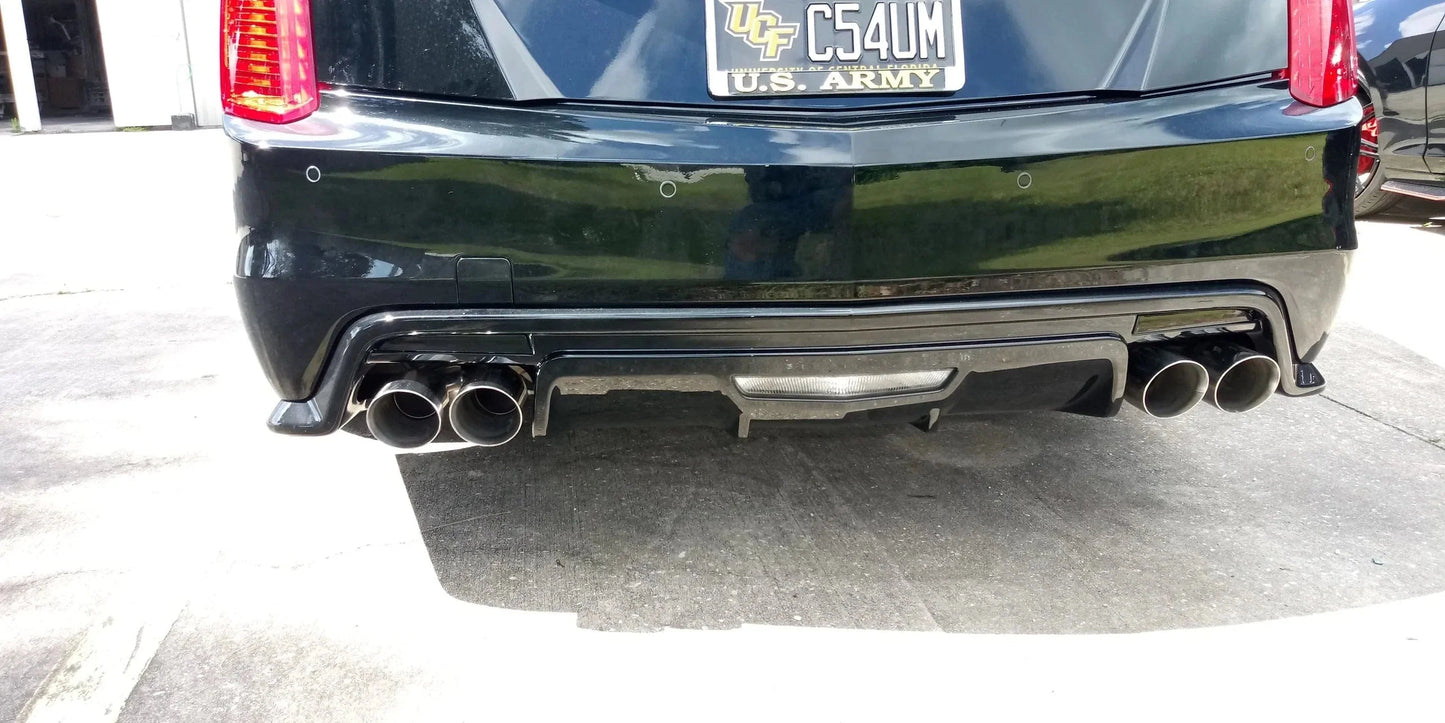 Replacing your plastic stock diffuser with this gloss black "CTSV Style" diffuser spruces up your 2017-2019 CTS V-Sport! Dual exhaust is necessary, and don't worry—we have a listing for that. Plus, we provide all the hardware and a light mount for a straightforward installation. Red reflectors are not included, but we do offer a selection of smoke reflectors in the dropdown.