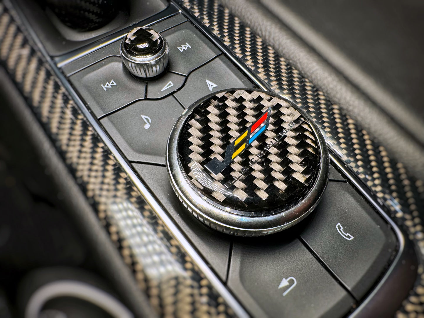 Experience an extra touch of sport & luxury with the our Center Console Media Wheel Knob Trim pieces in a glossed carbon fiber print featuring the iconic "V-Series" logo with "Blackwing" script in a stunning silver/chrome embossment!
