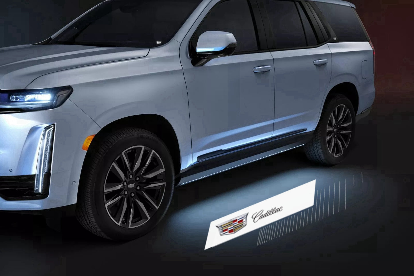 The Savage Cadillac 2015+ Escalade Colored Puddle "Shield and Script" Logo Lights in color will transform your Cadillac with these custom-look mirror logo lights! Installing takes only 10 minutes–simply place in the bottom of your mirror if you already have the LED light from the factory.